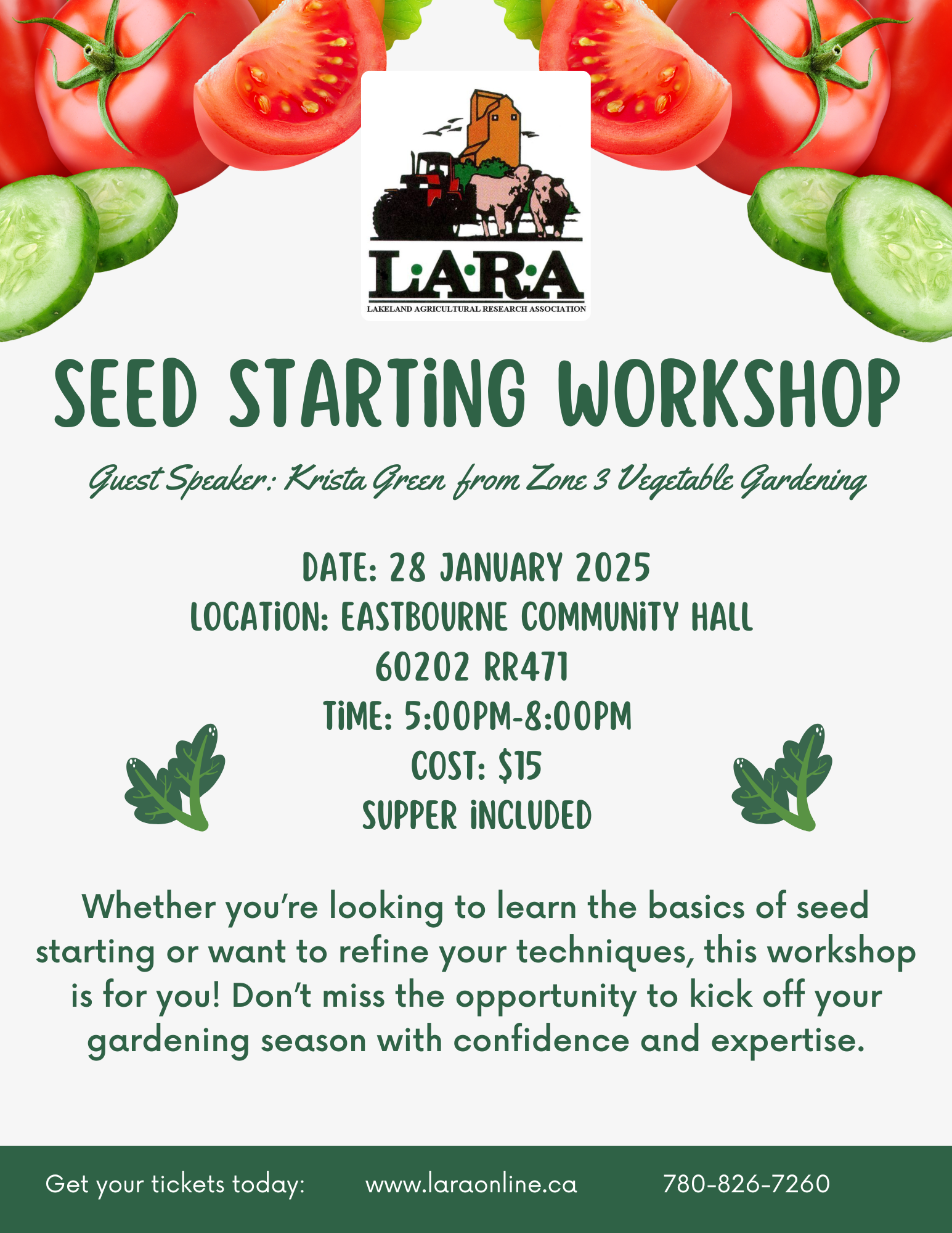 Join us for a hands-on Seed Starting Workshop on January 28, 2025, from 5:00 PM to 8:00 PM at Eastbourne Community Hall, 60202 RR471. This workshop, featuring guest speaker Krista Green from Zone 3 Vegetable Gardening, is perfect for those looking to learn the basics of seed starting or refine their techniques.