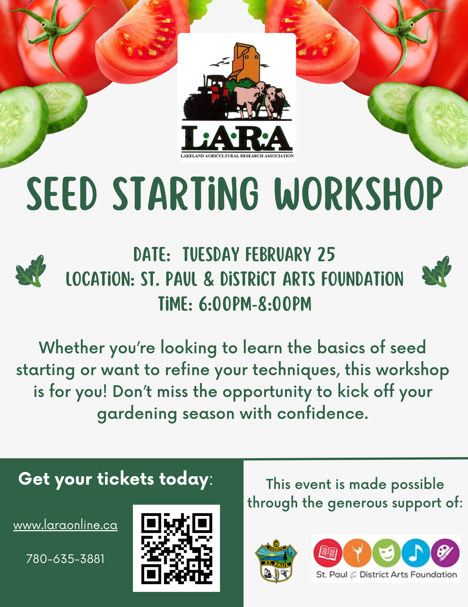 St. Paul & District Arts Foundation 4822 50 Ave, St. Paul, AB, CanadaLearn the basics of seed starting or refine your gardening techniques with our hands-on Seed Starting Workshop! Perfect for gardeners of all skill levels, this workshop will help you prepare for a successful gardening season. Event Details: Date: Tuesday, February 25 Time: 6:00 PM - 8:00 PM Location: St. Paul & District Arts Foundation Donβt…