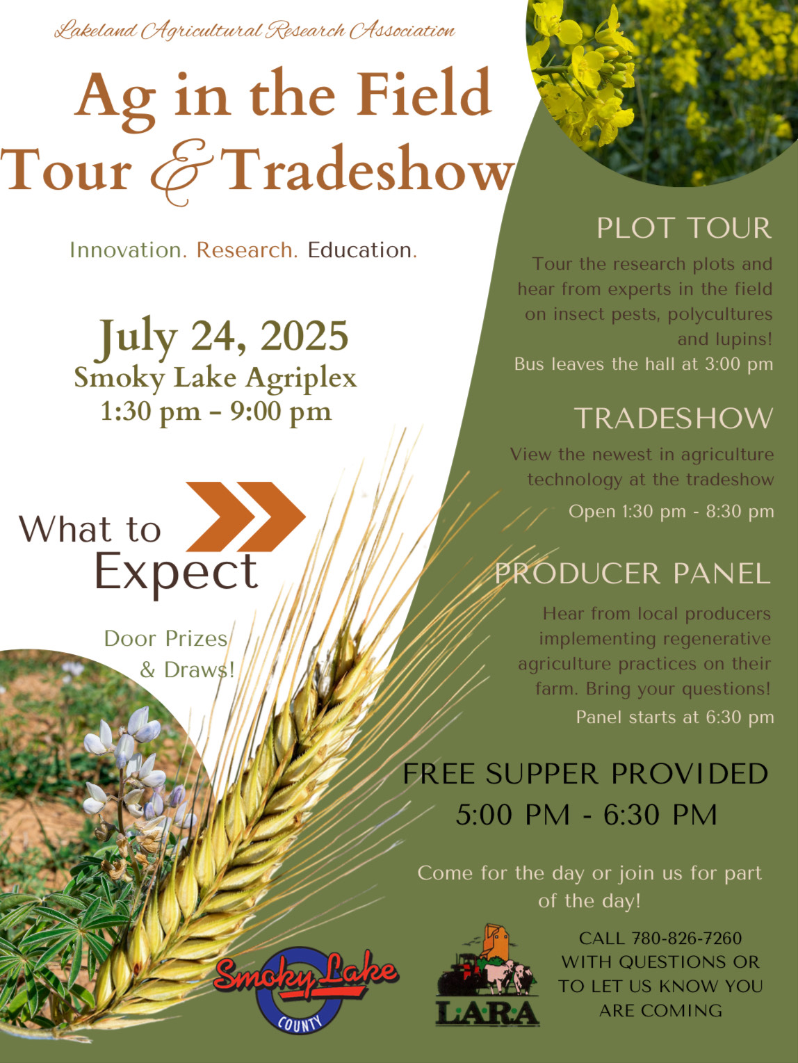 Smokey Lake Agriplex 4612 54 Ave, Smokey Lake, AB, CanadaJoin us on July 24, 2025 at the Smoky Lake Agriplex for a day filled with learning, innovation, research and education! Free supper provided at 5:00 pm! Register today by calling (780) 826-7260 or by Clicking Here!